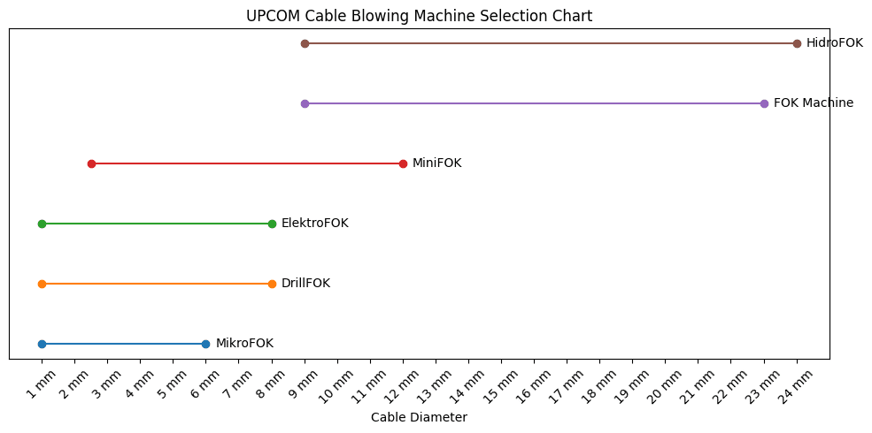 The complete UPCOM portfolio supports cable diameters from 1 mm to 24 mm, offering pneumatic, electric, drill-powered, and hydraulic solutions for different installation environments.